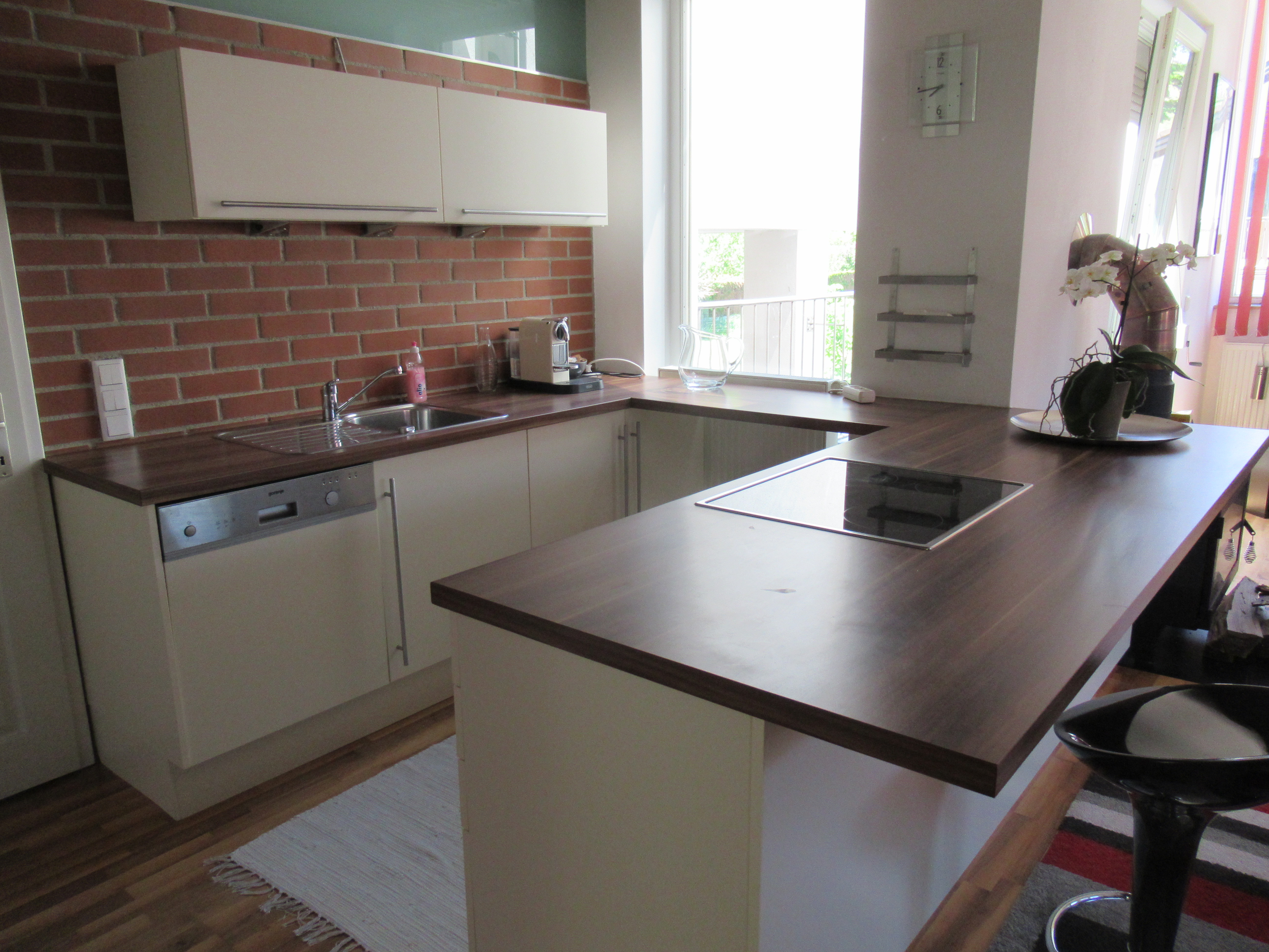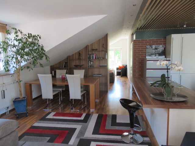 • offen gestalteter Küchen/Essbereich mit Kühlschrank und Geschirrspüler